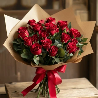 Этот великолепный букет, состоящий из 19 ярких красных роз, воплощает в себе силу и страсть любви. Каждая роза, аккуратно собранная в стильную крафтовую упаковку, словно говорит о глубоких чувствах и нежных эмоциях. Красный цвет символизирует не только романтику, но и преданность, делая этот букет идеальным подарком для вашей второй половинки. Крафтовая упаковка придаёт композиции естественный и современный вид, подчеркивая красоту и свежесть цветов.