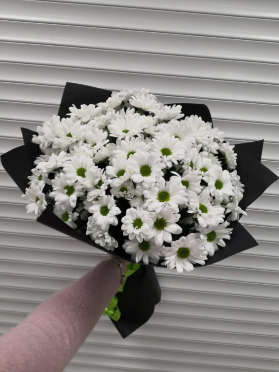 Для оформления букета выбрана стильная черная упаковка, которая добавляет нотку современности и утонченности. Матовая текстура бумаги создает эффектный контраст с яркостью хризантем, подчеркивая их естественную красоту.